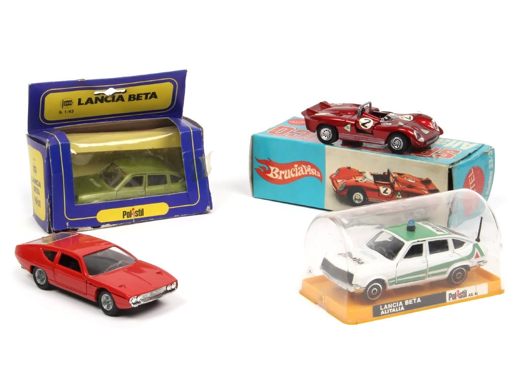 comprend : ALFA ROMEO 33/3 (boite sans mousse de protection), LANCIA BETA, LAMBORGHINI BERTONE & LANCIA BETA ALITALIA - quelques traces d'humidité sur certains modèles & boites (états 'b' & 'c' - un modèle sans) - on y retrouve les marques : POLITOYS, MEBETOYS & POLISTIL