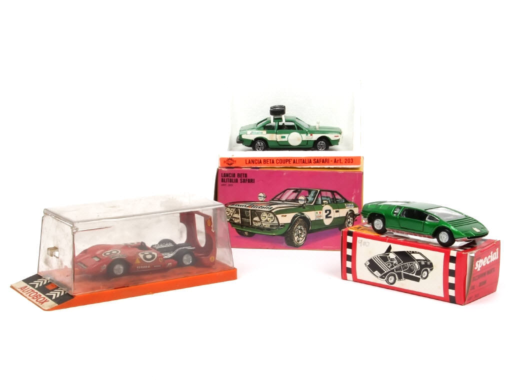 comprend : BIZZARRINI MANTA (boite sans mousse de protection), FERRARI 312P SEBRING & LANCIA BETA ALITALIA SAFARI - quelques traces d'humidité sur certains décalques - boites plus ou moins encrassées