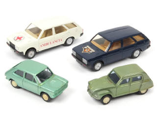 fabrication en plastique - 2 échelles différentes - moteurs à friction (fonctionnent) - comprend : SEAT 131 Police & Ambulance, CITROËN DYANE & SEAT 127 - carrosseries encrassées