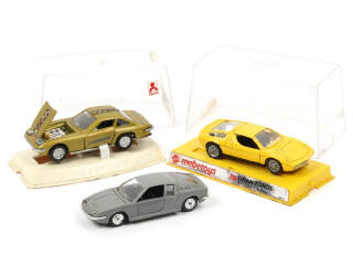 comprend : MASERATI BORA de la marque MEBETOYS (état 'A.b' - traces d'humidité sur les roues), MATRA 530 de fabrication russe (copie POLITOYS, état 'B') & LAMBORGHINI ISLERO (état 'B.b' - encrassé)