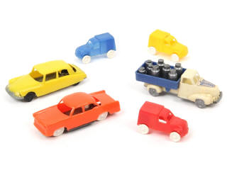 comprend : camion laitier promotionnel 'GERBER' (traces de colle sur le plancher - une partie de pare-choc avant manquante), CITROËN DS 19 de la marque ECF, SIMCA VERSAILLES & 3 fourgonnettes 2CV
