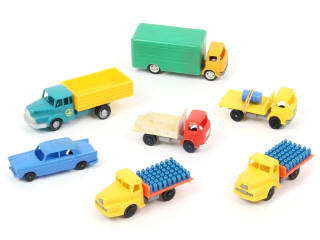 petite échelle - comprend : 2 UNIC brasseurs, 3 BERLIET GAK dont cargo 'BONUX', brasseur & plateau 'BONUX' & PEUGEOT 404 'BONUX' (pare-choc avant incomplet) - on y joint un UNIC 'AHM' de marque indéterminée