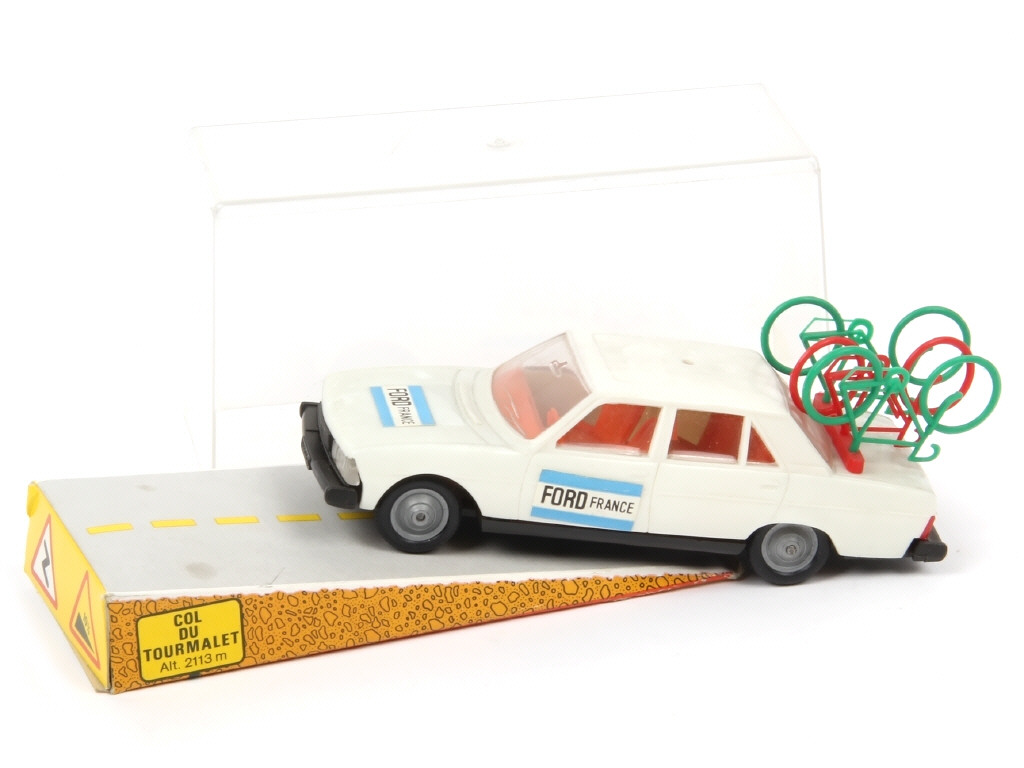 contient une PEUGEOT 604 'FORD FRANCE' transportant 3 vélos (un manquant) - petit élément manquant sur le toit - quelques accrocs & présence de ruban adhésif d'origine sur la boite