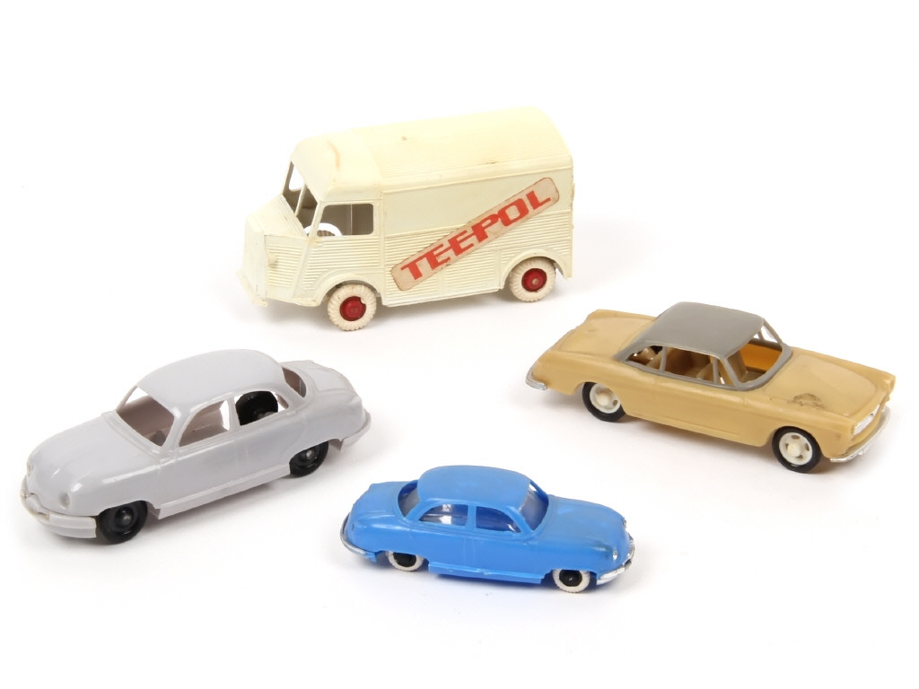 comprend : CITROËN 1200KG 'TEEPOL' (frottements & parties encrassées), PANHARD PL17 (2 exemplaires dans 2 échelles différentes - un modèle avec vitrage mal fixé) & PEUGEOT 404 Coupé (antenne manquante, partie fondue sur le capot moteur)