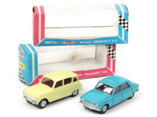 comprend : RENAULT 4L (traces de colle sur une roue - plaques minéralogiques à recoller) & PEUGEOT 204 (quelques frottements sur la carrosserie - sans plaques minéralogiques) - boites encrassées, avec traces d'humidité