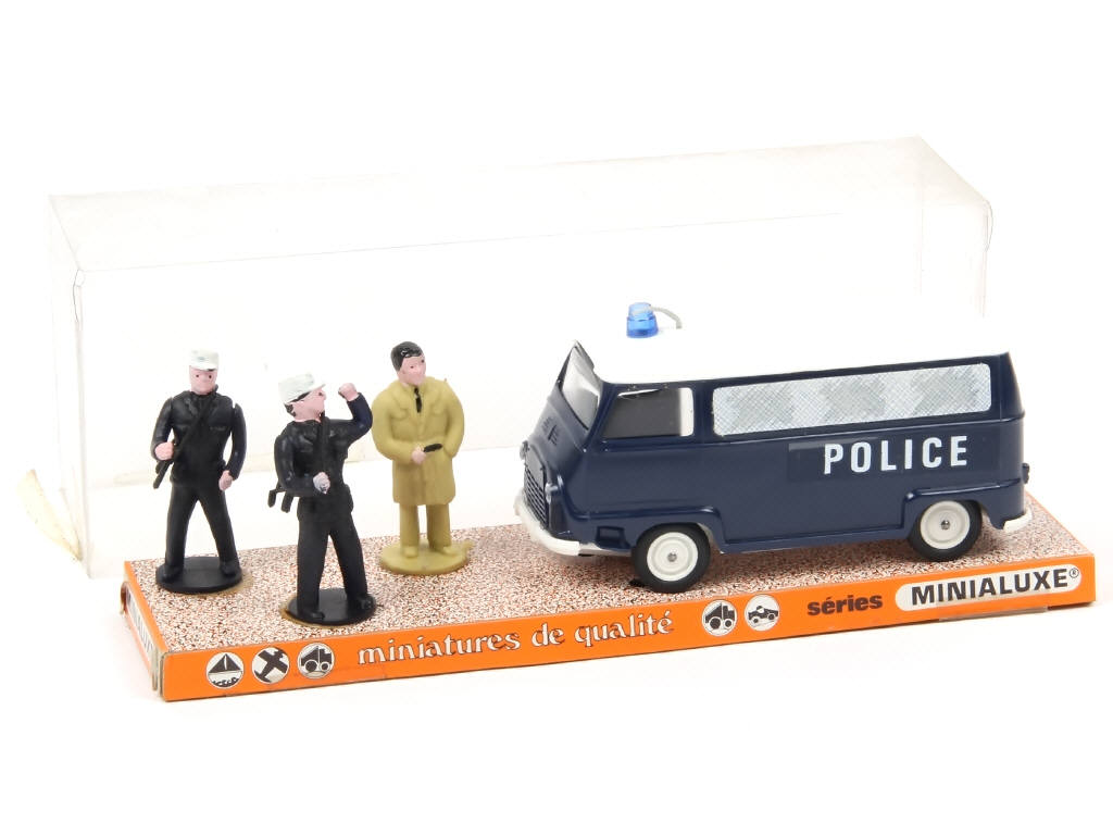 d'après le roman : 'L'INSPECTEUR JAKO EN ACTION' - contient : RENAULT ESTAFETTE 'POLICE' (antenne fêlée), 2 policiers & un inspecteur - ensemble fixé sur socle de présentation (quelques petits accrocs par endroits)
