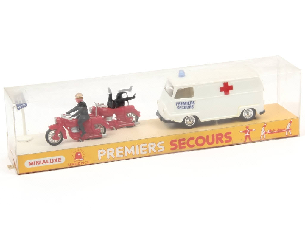 échelle 1/32ème - contient : RENAULT ESTAFETTE ambulance, 2 motards & panneau de signalisation - très légères déformations par endroits - petites déchirures sur le blister de boîte