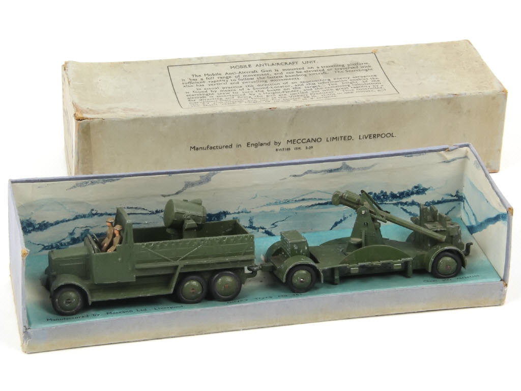 coffret produit de 1939 à 1941 (décoloré, avec cale) - contient : camion-projecteur (référence 161A, traces de métal fatigue plus ou moins importantes avec petites déformations & un petit manque de matière sur une aile, parties repeintes, avec 2 soldats non d'origine, fixation de projecteur non d'origine) & canon de DCA sur plateforme mobile (référence 161B, traces de métal fatigue) - sans figurine - pneus séchés & déformés