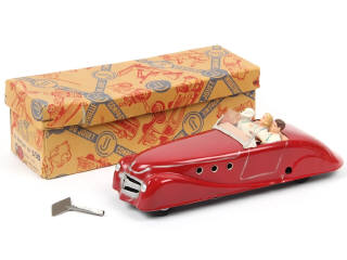modèle proche de l'état 'A+' - longueur 23 cm - version de 1954, avec 2 personnages & un caniche - avec mention 'VIVA GRAND SPORT' sur l'étiquette de désignation de boîte - avec moteur à clef (fonctionne) & clef - vitre de pare-brise très légèrement déformée - SUPERBE !