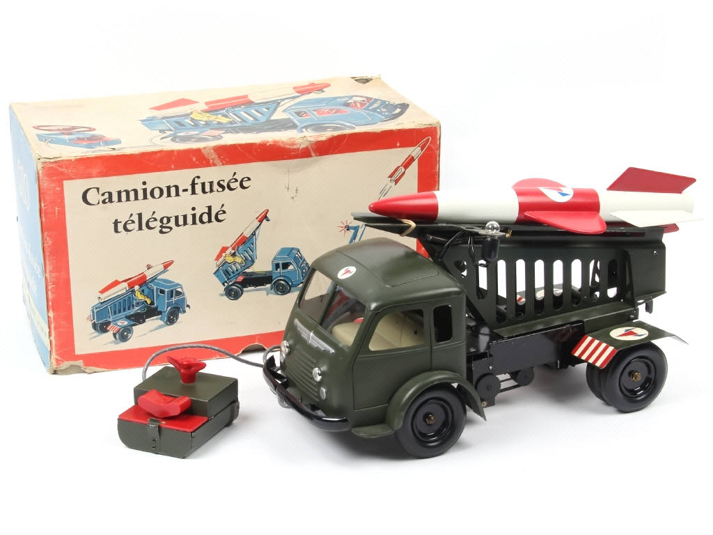 longueur 34 cm - avec moteur à piles, direction, gyrophare lumineux & système d'élévation de rampe (fonctionnent) - la télécommande (une petite gravure sur celle-ci) permet la marche avant & arrière, la direction, la montée & la descente de la rampe de lancement (axe de lancement de fusée non d'origine) - avec 2 personnages (dont un décollé de son siège, une petite perforation sur le dossier) & fusée - quelques manques de carton sur le couvercle de boîte