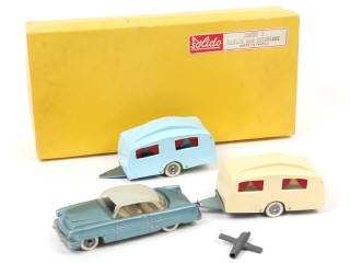 modèles assemblés - contient : une FORD MERCURY (petits frottements sur le vitrage, sans volant) & une caravane (vitrage déformé, lunette arrière fêlée) - avec socle de présentation & ficelles de maintien - on y joint une clef de montage (un petit manque) & une caravane supplémentaire (carrosserie déformée)