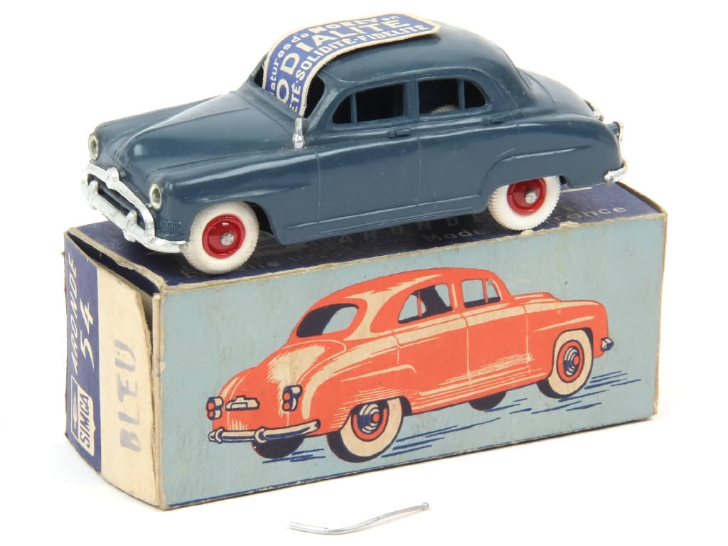 antenne cassée - très légère déformation de la carrosserie - jantes très légèrement fondues - pare-choc arrière cassé - avec étiquette RHODIALITE bleue (non détachée de son support) - boîte avec mention 'BLEU' au tampon sur l'un des rabats