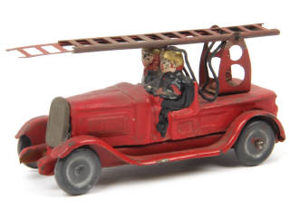 réalisation en plâtre & farine avec châssis en tôle (petites traces d'oxydation) & roues en métal - longueur : 8,5 cm - calandre recollée - un fil de fer non d'origine sur le support d'échelle - carrosserie légèrement encrassée