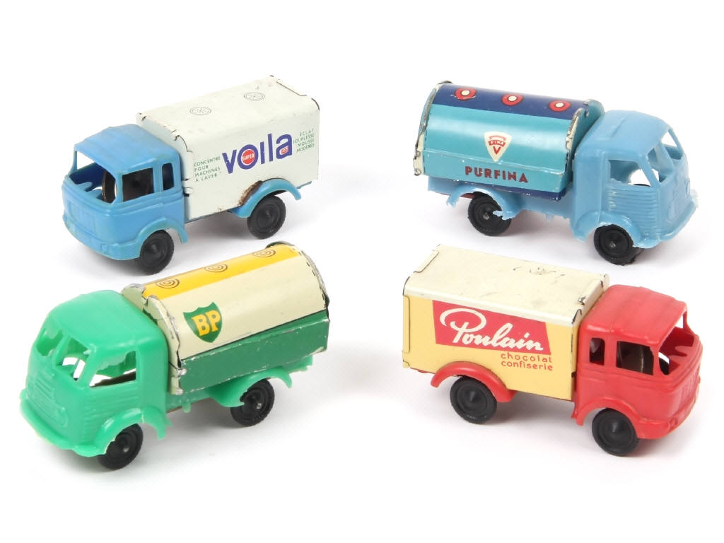 moteurs à friction (fonctionnent) - on y retrouve les publicités 'POULAIN' & 'VOILA' (importantes traces d'oxydation sur les planchers & les moteurs) - on y joint 2 exemplaires (copies) de la marque VOLVO - rayures plus ou moins importantes sur les parties métalliques