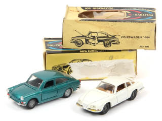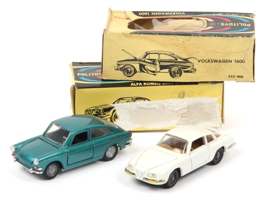 comprend : VOLKSWAGEN 1600 (état 'A.d') & ALFA ROMEO 2600 (état 'B.d' - manques de pellicule chromée sur le pare-choc avant - petits frottements - vis de châssis oxydée) - jantes plus ou moins ternies - importants manques de papier sur les boites