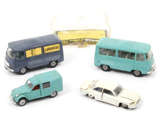 miniatures reproduisant les modèles : PEUGEOT J7 (2 exemplaires différents), CITROËN 3 CV & PANHARD 24 BT (en boîte état 'd') - carrosseries plus ou moins déformées & encrassées