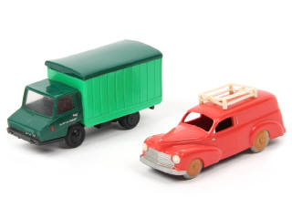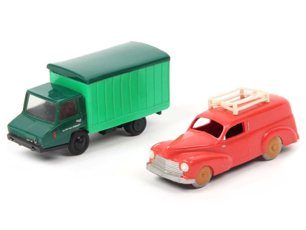 moteur à friction (à revoir) - déformations plus ou moins importantes sur l'ensemble du modèle (toit plus ou moins endommagé) - on y joint une PEUGEOT 203 fourgonnette de la marque MINIALUXE (état 'B', manque bagages, carrosserie légèrement déformée)