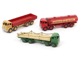comprend les versions : plateau à chaînes (un support cassé), citerne 'ESSO' (citerne en état 'D' avec une extrémité déficiente avec un manque de peinture, un axe de roues déformé) & plateau à ridelles (un petit éclat sur le toit de cabine) - quelques petites traces de métal fatigue sous les peintures (petites bulles plus ou moins importantes suivant les modèles)