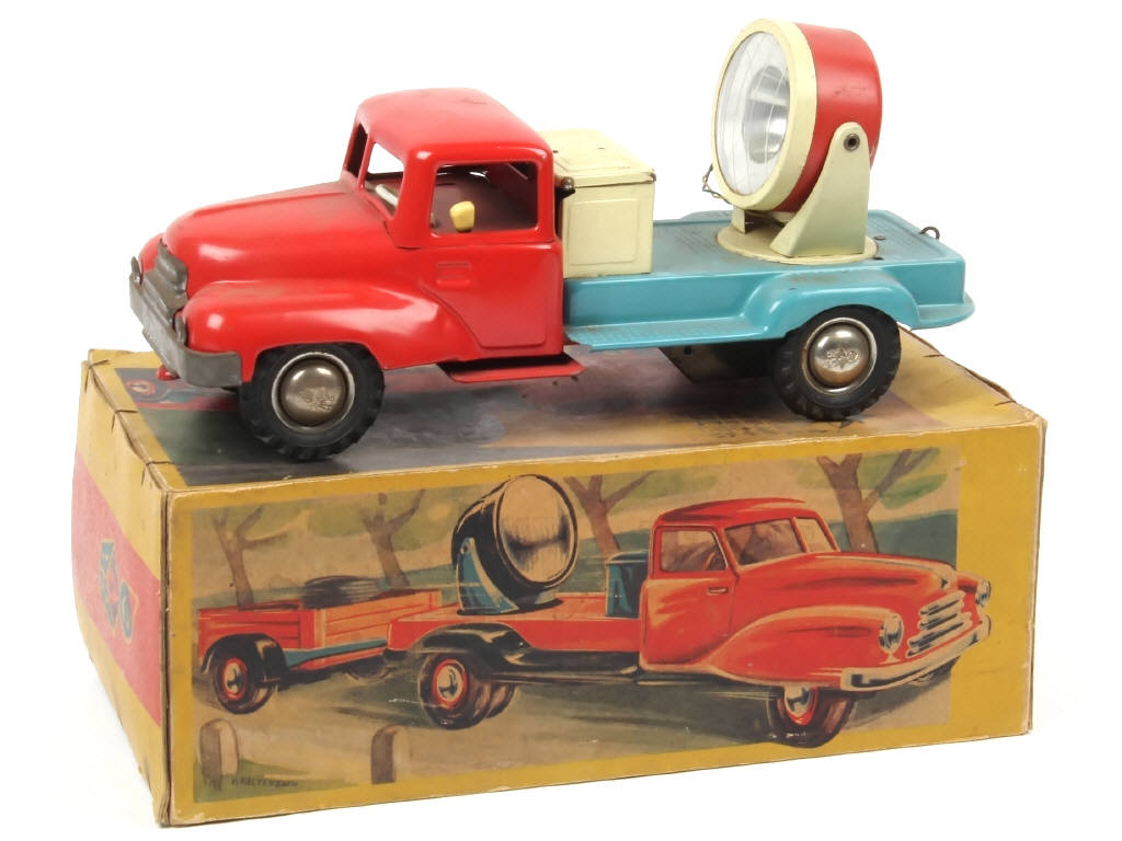 B.S (ALLEMAGNE) Camion plateau avec projecteur en tôle peinte rouge, bleu & crème