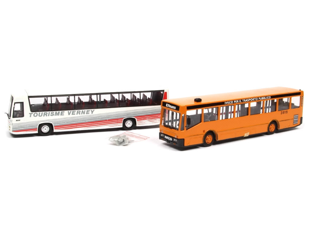 manque rétroviseurs - quelques micro-éclats & frottement majeur (sur l'aile avant gauche) - pneus plus ou moins poisseux - on y joint un autocar IVECO 'EFFEUNO' de la marque OLD CARS en état 'C' avec manques & parties cassées ou à repositionner (notamment sièges & plancher)