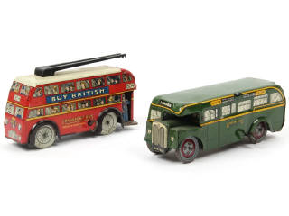 longueur : 18 cm - comprend : un autobus & un trolleybus - moteurs à ressort (fonctionnent) - un exemplaire avec parties ternies & plus ou moins déformées - quelques petits manques