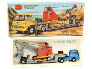 CORGI TOYS (GB) GS27 BEDFORD TK Semi-remorque plateau surbaissé avec pelleteuse PRIESTMAN bleu ciel, gris métal, jaune d'or & orange