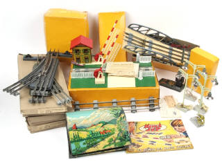 non testé - comprend notamment : pont, tunnel & lampadaires - quelques petites parties cassées & manquantes - parties ternies & traces d'oxydation par endroits - les boîtes sont en état de 'c' à 'd' - on y joint un ensemble de rails de la marque (plus ou moins ternis avec quelques petits manques)