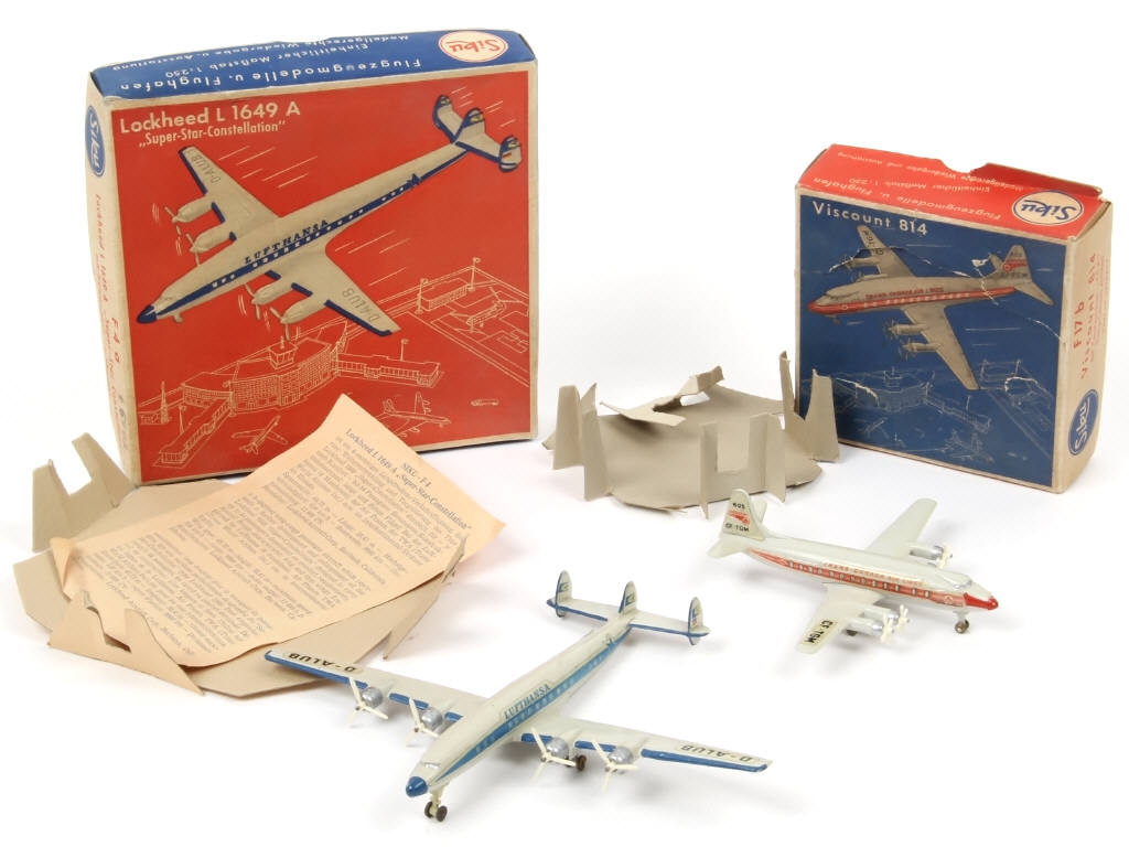 échelle 1/250ème - comprend : VISCOUNT 814 (autocollants plus ou moins décolorés, importantes déchirures sur la boîte) & LOCKHEED L 1649 A (un train d'atterrissage cassé & manquant)