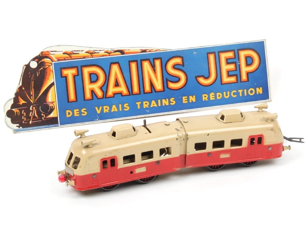 longueur : 34 cm - moteur électrique (non testé) - quelques frottements majeurs sur le soufflet - une ampoule non d'origine - on y joint une publicité cartonnée de détaillant 'TRAIN JEP' (état 'b')