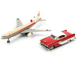 longueur : 29 cm - avec moteur à pile, phares électriques & mécanisme (à revoir) - parties chromées légèrement ternies - avec marquages 'SATO'/'ALPS' sous le plancher - on y joint un LOCKHEED L-1011 TRISTAR (état 'B', une rayure sur l'avant de la carlingue, moteur à pile & système lumineux non testés, un autocollant retouché) de la marque NOMURA