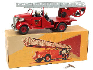 longueur 39 cm - avec moteur à clef (fonctionne), clef, direction & 4 pompiers (sans phare électrique) - très légers frottements par endroits - quelques petits accrocs & très légères déchirures sur la boîte par endroits