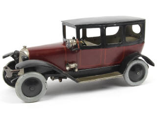 fabriquée de 1926 à 1933 - longueur 34 cm - avec moteur à clef (fonctionne), clef, éclairage électrique (non testé, manque optiques de phares) & direction par le volant - quelques retouches plus ou moins importantes par endroits - peinture noire craquelée - petits manques de peinture sur les roues