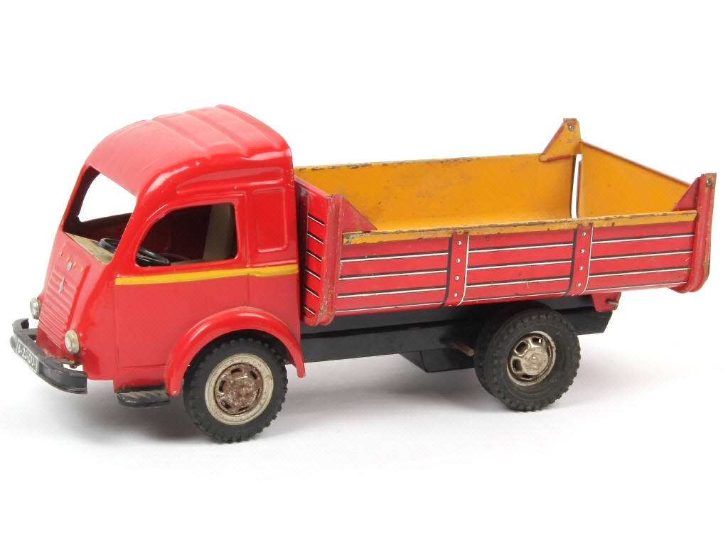 fait partie du coffret 'MULTICAMION 3 EN 1' - longueur : 33 cm - avec moteur à clef (fonctionne), direction & benne basculante (état 'D', non d'origine) - traces d'oxydation plus ou moins importantes par endroits - petites retouches sur la benne (axe de maintien, un phare & une fixation d'essieu non d'origine)