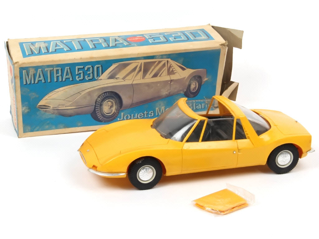 longueur 30 cm - moteur à friction (fonctionne) - avec sachet contenant les 2 toits amovibles - carrosserie légèrement encrassée - traces d'humidité sur la boîte (déchirures plus ou moins importantes par endroits)