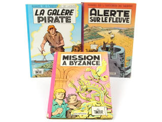 comprend : LA GALERE PIRATE (EO de 1965 - dos papier rond - très bon état général - petite déchirure sur le dos - légers frottements aux coiffes), ALERTE SUR LE FLEUVE (EO 1964 - dos papier rond - bon état général - manque de matière sur une coiffe - petite déchirure sur le dos) & MISSION A BYZANCE (EO 1962 - bon état général - manques de matière sur les coiffes - inscription en page de titre)