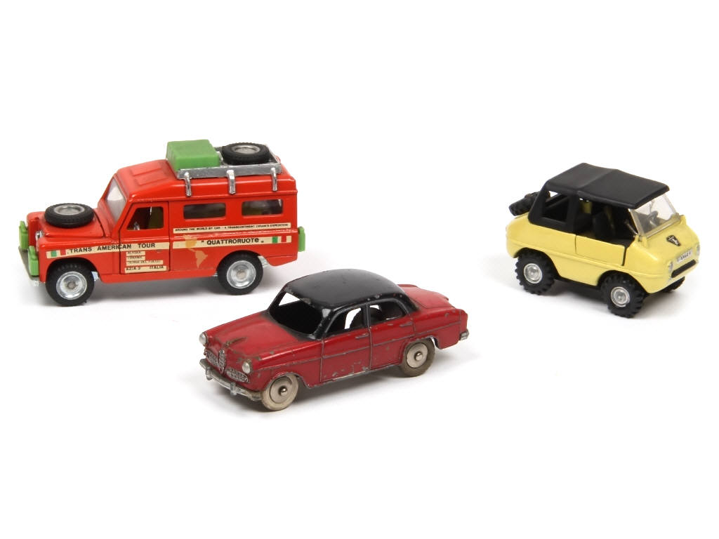 comprend les modèles : LAND ROVER, RANGER FERVES (carrosserie plus ou moins déformée) & ALFA ROMEO GIULIETTA - on y retrouve les marques : MERCURY & MEBETOYS - pneus plus ou moins séchés dont 2 non d'origine