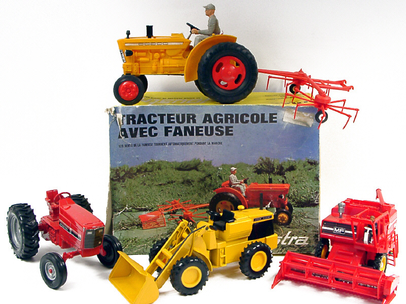 longueur 39 cm - moteur à clef (fonctionne) - avec système de pierre à briquet - 2 garde-boue cassés - plancher déformé - manque un bras & un élément de la faneuse ainsi qu'une partie de la cheminée d'échappement