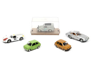 comprend : FIAT 126, 500A van 'LAME GILETTE BLU' 1949, LAMBORGHINI 350, PORSCHE CARRERA 10 - on y retrouve les marques : POLITOYS, MEBETOYS & BRUMM - pneus plus ou moins séchés
