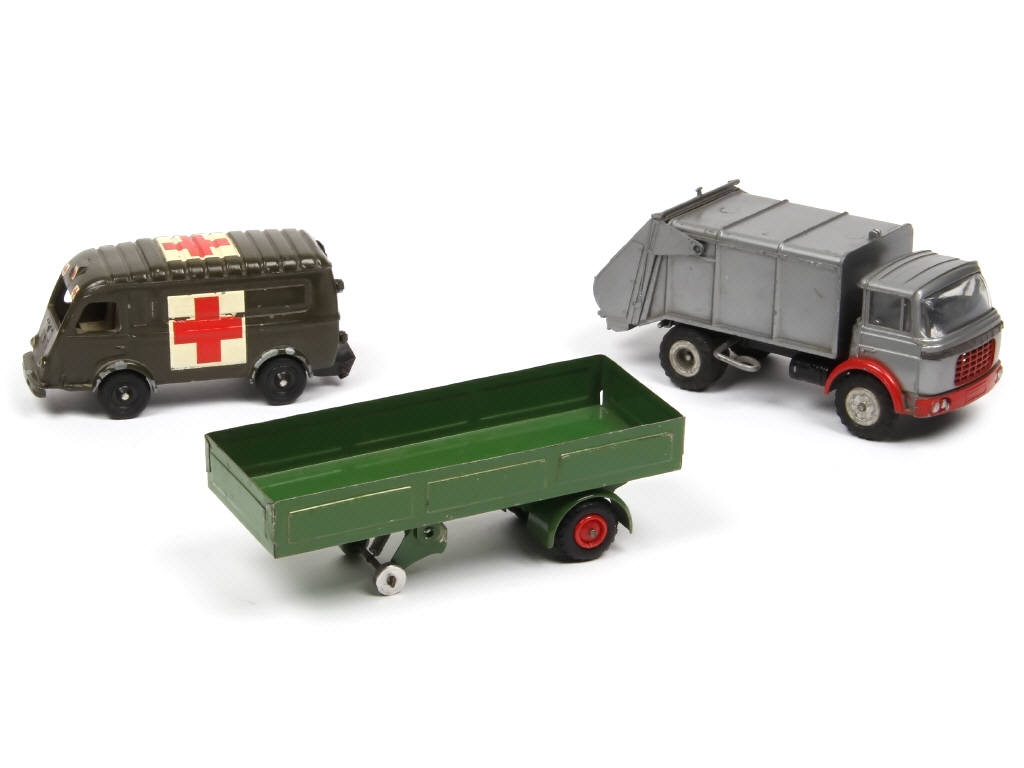 comprend : RENAULT 1000 KG ambulance militaire (version avec plancher de couleur gris - avec un brancard), BERLIET GAK Benne à ordures (version sans décalques) & remorque du tracteur RENAULT 120CV (sans bâche) - on y retrouve les marques : C.I.J & JRD - quelques pneus séchés