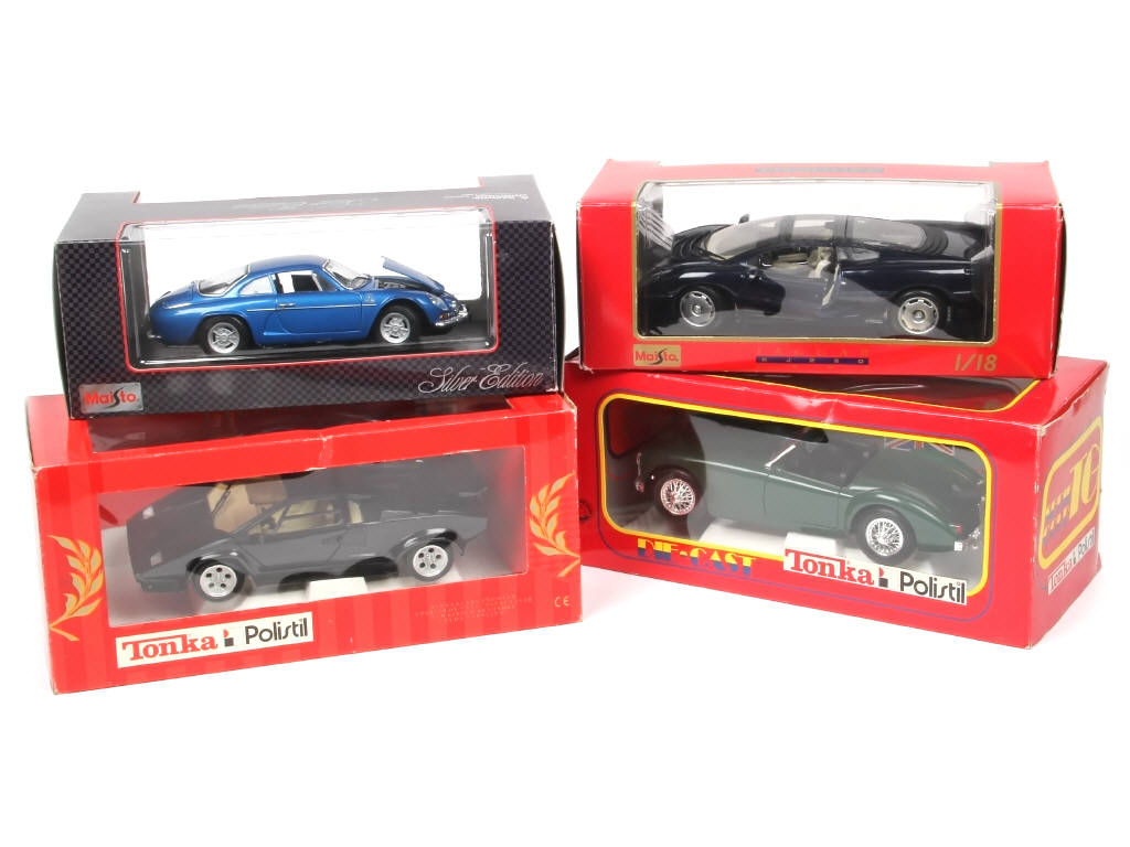 comprend les modèles : ALPINE RENAULT, JAGUAR, LAMBORGHINI & MG - on y retrouve les marques : POLISTIL & MAISTO - quelques accrocs & frottements sur 3 boites