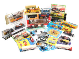 différentes échelles - on y retrouve notamment les marques : ERTL, SIKU, CORGI TOYS & MAJORETTE - 4 exemplaires sans boîte dont un dans un état 'D' - quelques accessoires manquants sur certains modèles