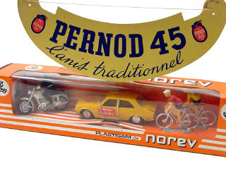 contient : une PEUGEOT 504 'PRESSE NOREV', un motard de la police & 2 cyclistes - on y joint une visière publicitaire du Tour de France en carton 'PERNOD 45'