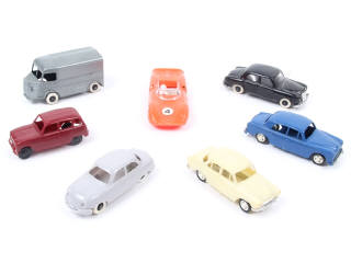 échelle 1/48ème - miniatures reproduisant les modèles : CITROËN, PANHARD, SIMCA (carrosserie jaunie avec petites craquelures), RENAULT, MERCEDES, PEUGEOT & FERRARI - quelques manques & parties cassées