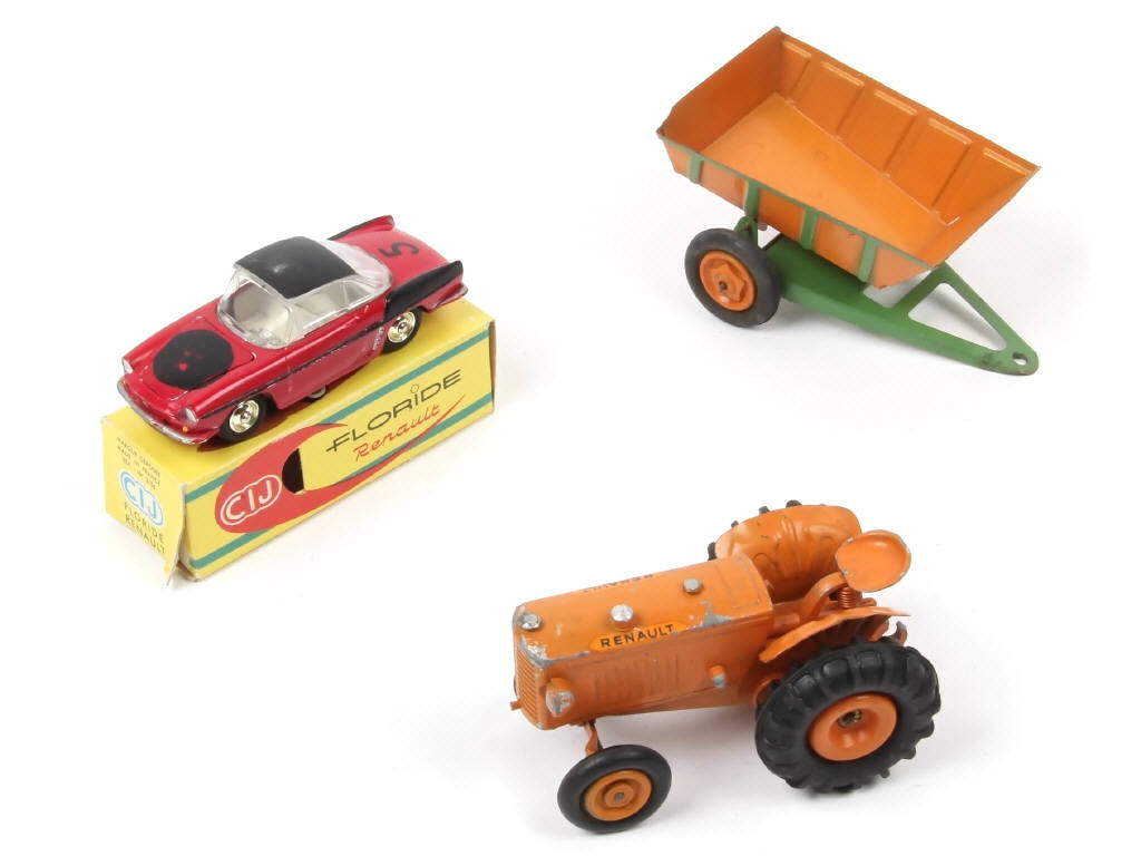 comprend : RENAULT FLORIDE (nombreuses parties repeintes, accrocs sur la boîte avec annotations) & tracteur agricole (avec manques & parties cassées, sans conducteur, éclats majeurs) avec remorque