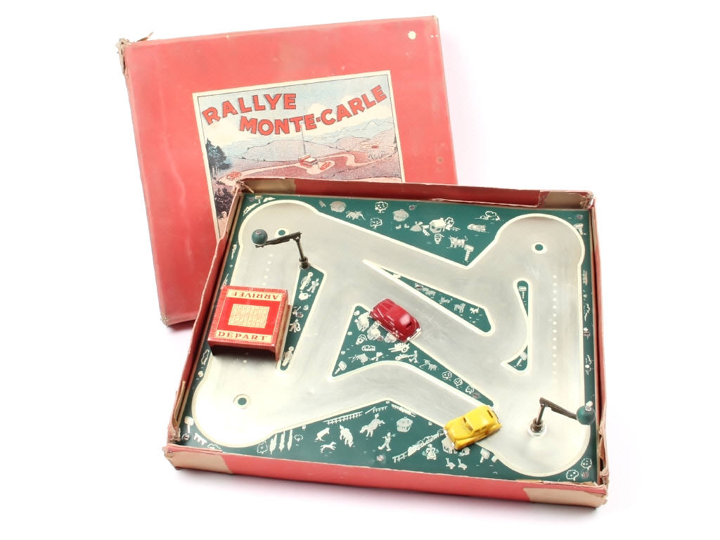 dimensions du coffret : 43 x 35 cm - contient un plateau de jeu en tôle & bois, 2 voitures en plastique & 2 manivelles (système à revoir) - possibilité d'accessoires manquants