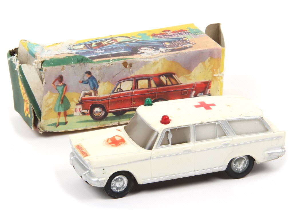longueur 11,5 cm - moteur à friction (à revoir) - quelques traces d'oxydation sur le plancher - décalque de capot-moteur incomplet - carrosserie légèrement encrassée