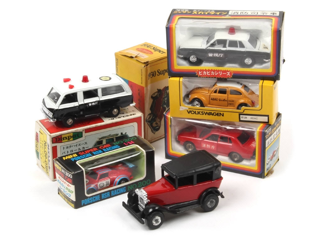 échelles différentes - on y retrouve notamment les marques : YONEZAWA TOYS DIAPET & KADO - un exemplaire avec gyrophare électrique non testé - on y joint une FORD 1930 de la marque SAN MAURICIO (Argentine, boîte en état 'c', jantes ternies)