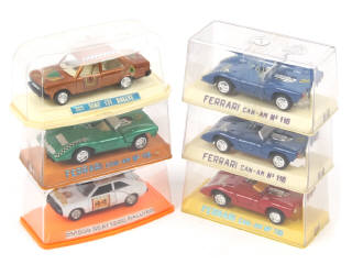 miniatures reproduisant les modèles : FERRARI (4 exemplaires) & SEAT - on y retrouve les marques : PILEN, JOAL & MIRA