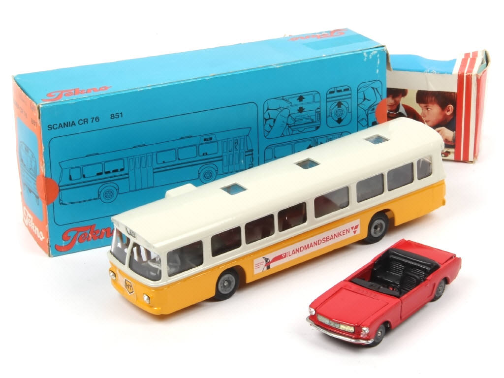 version avec vignette 'HT' sur la calandre & publicité 'FAXE KORAL' sur le flanc droit - manque entourages de verrières de toit - quelques manques plus ou moins importants sur certains décalques - petites fêlures sur le vitrage - on y joint une FORD MUSTANG (référence 854, avec planches de décalques dans le coffre, sans autre accessoire, vitrage manquant, jantes ternies)