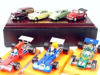 contient : une FORD ANGLIA, une MORRIS TRAVELLER, une TRIUMPH HERALD & une VOLKSWAGEN COCCINELLE cabriolet - série limitée avec certificat n°0506/2500 - avec socle de présentation en bois, sachet d'accessoires, clips de fixation sur le socle, planche de plaques minéralogiques & notice
